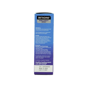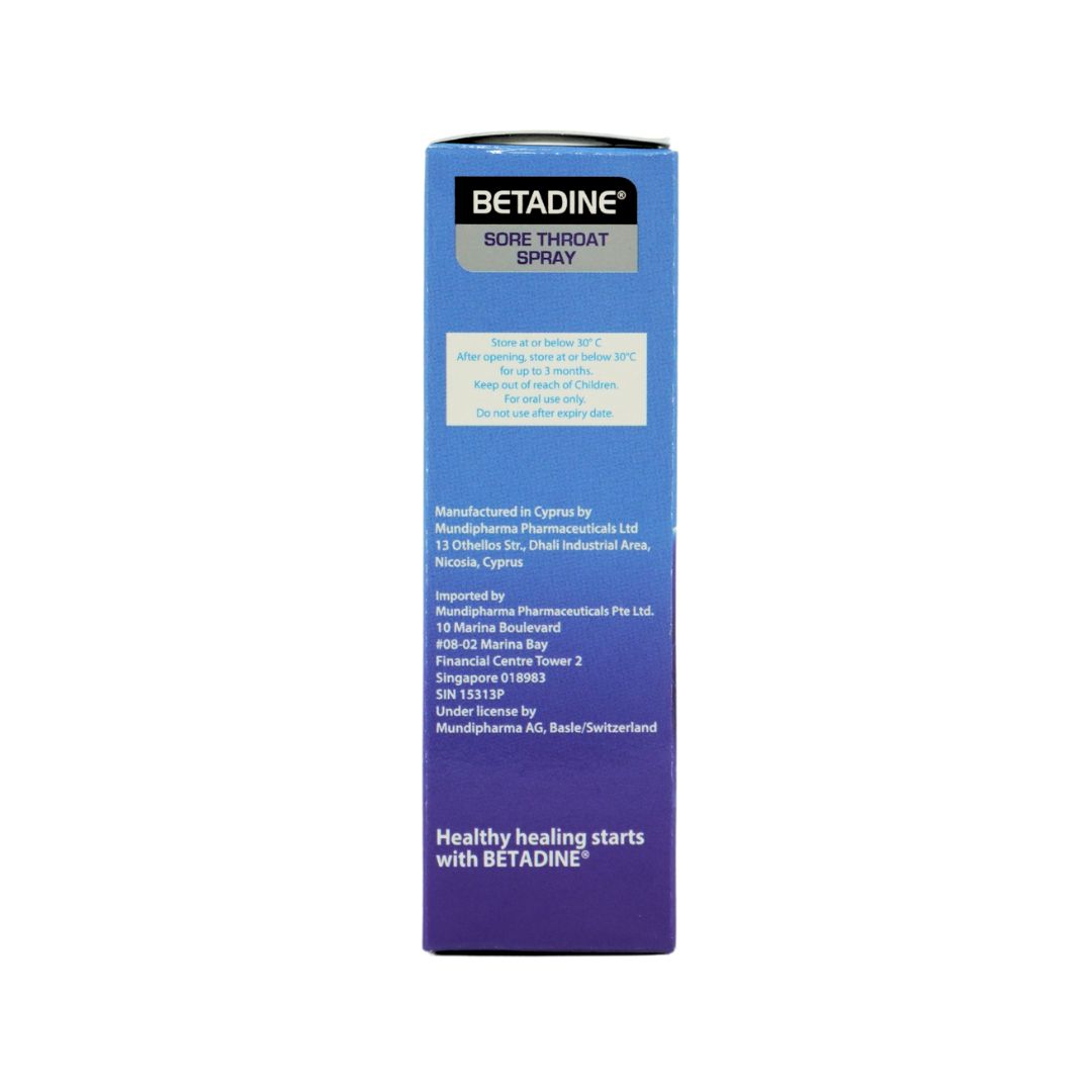 "BETADINE® Sore Throat Spray is for protection and symptomatic relief of sore throat and mouth ulcers, it contains active ingredient Povidone- Iodine 0.45% w/v.