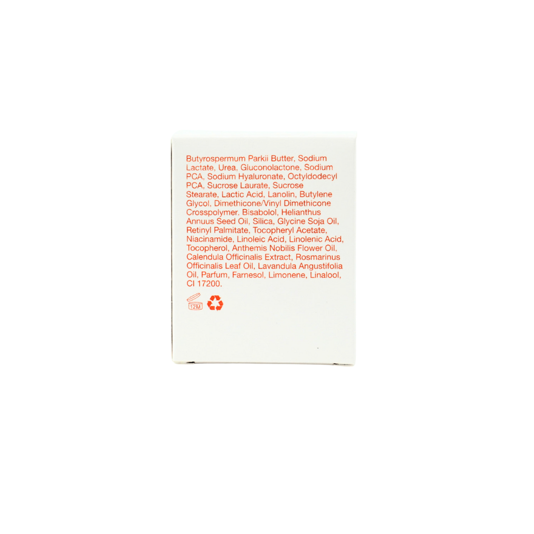 Paraffinum Liquidum, Isopropyl Palmitate, Triisononanoin, Cetearyl Ethylhexanoate, Glycerin, Butyrospermum Parkii Butter, Aqua, Isopropyl Myristate, Urea, Caprylic/Capric Triglyceride, Isostearyl Isostearate, C26-28 Alkyl Dimethicone, Sodium Lactate, Gluconolactone, Sodium PCA, Sodium Hyaluronate, Octyldodecyl PCA, Sucrose Laurate, Sucrose Stearate, Lactic Acid, Lanolin, Butylene Glycol, Dimethicone/Vinyl Dimethicone Crosspolymer, Bisabolol, Helianthus Annuus Seed Oil, Silica, Glycine Soja Oil, BHT, Retinyl Palmitate, Tocopheryl Acetate, Niacinamide, Linoleic Acid, Linolenic Acid, Tocopherol, Anthemis Nobilis Flower Oil, Calendula Officinalis Extract, Rosmarinus Officinalis Leaf Oil, Lavandula Angustifolia Oil, Parfum, Farnesol, Limonene, Linalool, CI 17200.