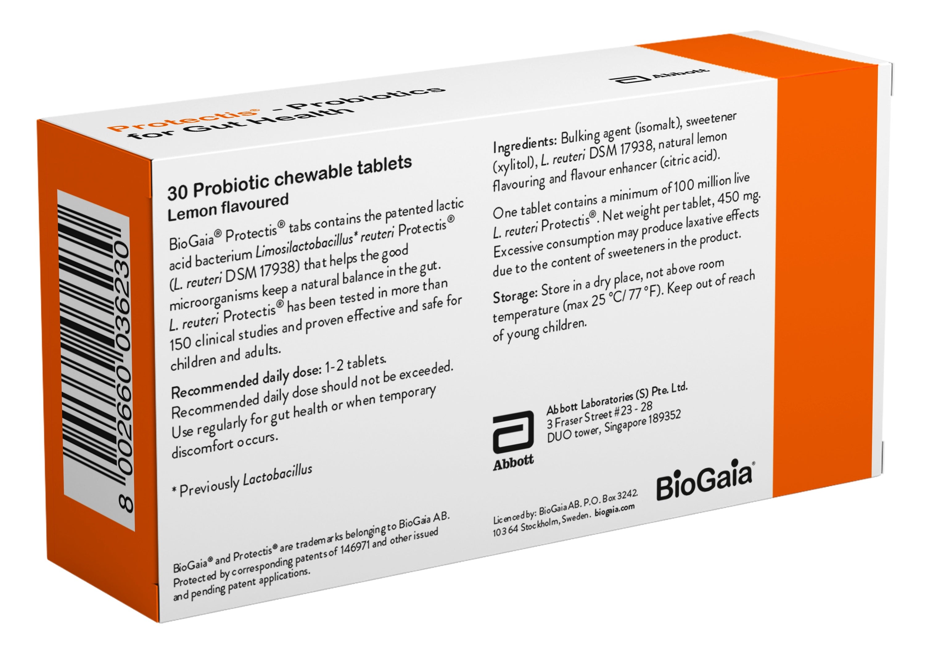 BioGaia Protectis Chewable Tablets contain L. reuteri DSM 17938, helps to support a natural balance of good microorganism in the gut. Made for the Whole Family.