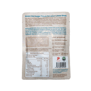The gentle sautéing of Salmon with hints of ginger sets our delightful fish recipe apart, enchanting even the most discerning palate. Containing naturally occuring Omega-3, Salmon is an ideal fish for weaning babies, crucial for brain development and a robust immune system. Antioxidants and Vitamin A-rich pumpkin, minced carrot and Goji completes this mildly sweet, earthy and nutritious meal for your baby. The stew is easy and convenient to prepare, requiring only hot water to warm the pouch, making it travel-friendly as well! Our stews are BPA free and are made up of 4-layer food grade Aluminium, our stews go through a high temperature retort process to ensure that there are no bacteria left in the pouches that will cause contamination.