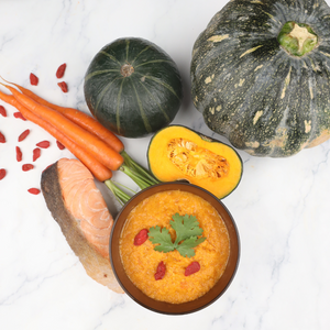 Pumpkin (52%), Salmon (26%), Carrot (16%), Goji (2%), Canola Oil (2%), Ginger (1%), Water (1%)