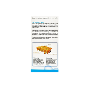 The Duolac probiotics are protected by a unique patented dual coating technology developed to maximise their survival rate 100 times higher than uncoated probiotics. The dual coating technology protects the probiotics from mechanical pressure during manufacturing, transportation, heat and moisture. Its unique pH-dependent release mechanism ensures survivability of probiotics against gastric acid and bile salts, while releasing them in the intestine to ensure their effective colonisation and proliferation.