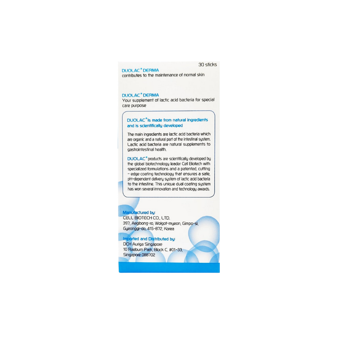 Duolac Derma is a lactic acid bacteria supplement for the whole family which contributes to the maintenance of normal skin. It is made from natural ingredients and is scientifically developed.