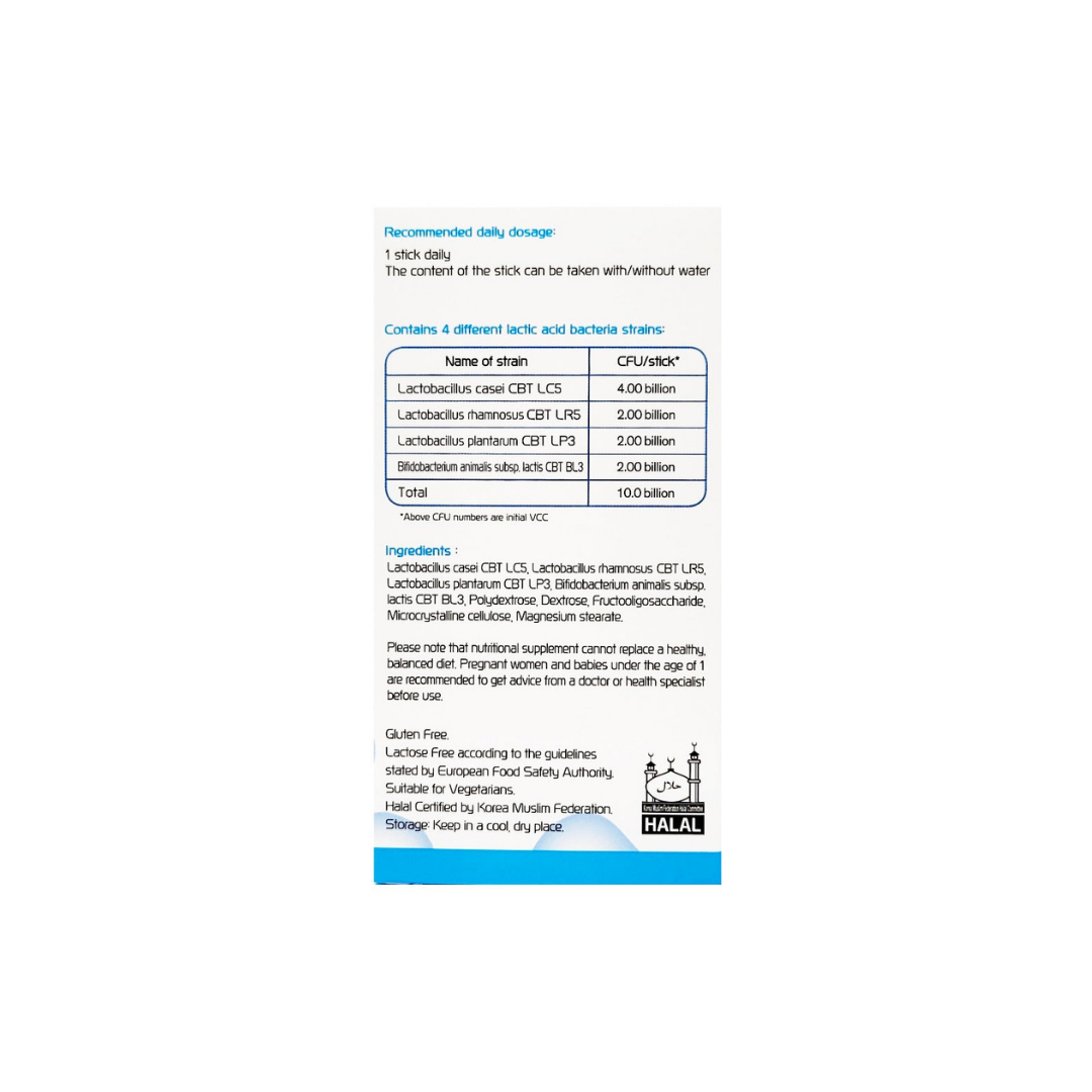 Lactobacillus casei CBT LC5, Lactobacillus rhamnosus CBT LR5, Lactobacillus plantarum CBT LP3, Bifidobacterium animalis subsp. lactis CBT BL3, Polydextrose, Dextrose, Fructooligosaccharide, Microcrystalline cellulose, Magnesium stearate.