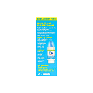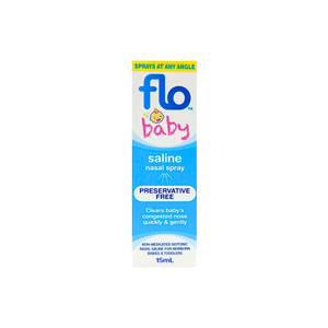 Flo Baby Saline Nasal Spray helps clear a baby‘s runny or blocked nose quickly, gently and easily. Flo Baby Saline offers advanced technology to deliver a sterile, preservative-free, non-medicated, non-sting nasal saline for babies and toddlers. Suitable for daily use.