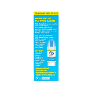 Flo Baby Saline Nasal Spray helps clear a baby‘s runny or blocked nose quickly, gently and easily. Flo Baby Saline offers advanced technology to deliver a sterile, preservative-free, non-medicated, non-sting nasal saline for babies and toddlers. Suitable for daily use.