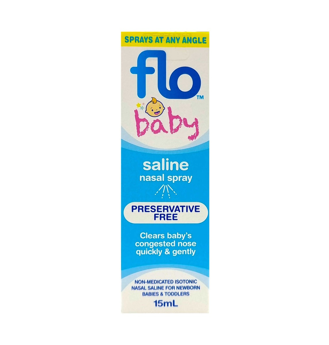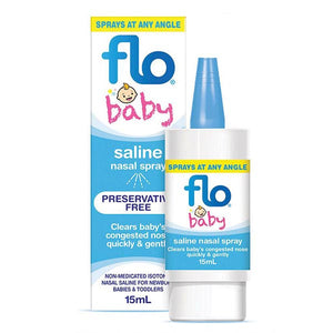 Flo Baby Saline Nasal Spray helps clear a baby‘s runny or blocked nose quickly, gently and easily. Flo Baby Saline offers advanced technology to deliver a sterile, preservative-free, non-medicated, non-sting nasal saline for babies and toddlers. Suitable for daily use.