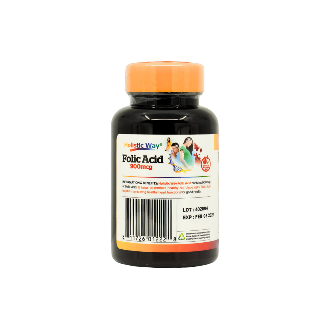 Holistic Way Folic Acid is a dietary supplement containing 900mcg of folic acid, a B vitamin that plays a crucial role in the production of healthy red blood cells. Folic acid is also essential for the proper development of the fetal neural tube during pregnancy.
