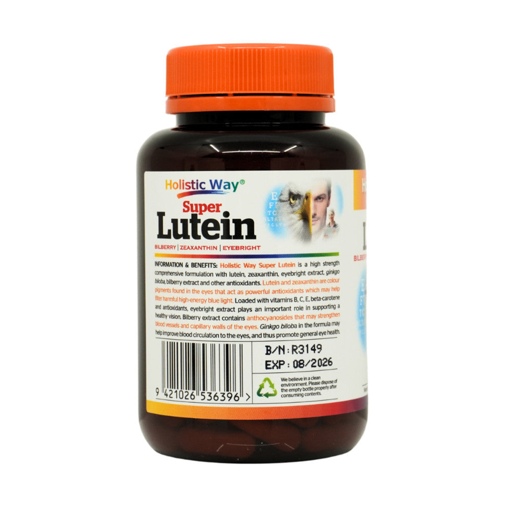 Holistic Way Super Lutein is a comprehensive high-strength formulation that includes lutein, zeaxanthin, eyebright extract, ginkgo biloba, bilberry extract, and other antioxidants.