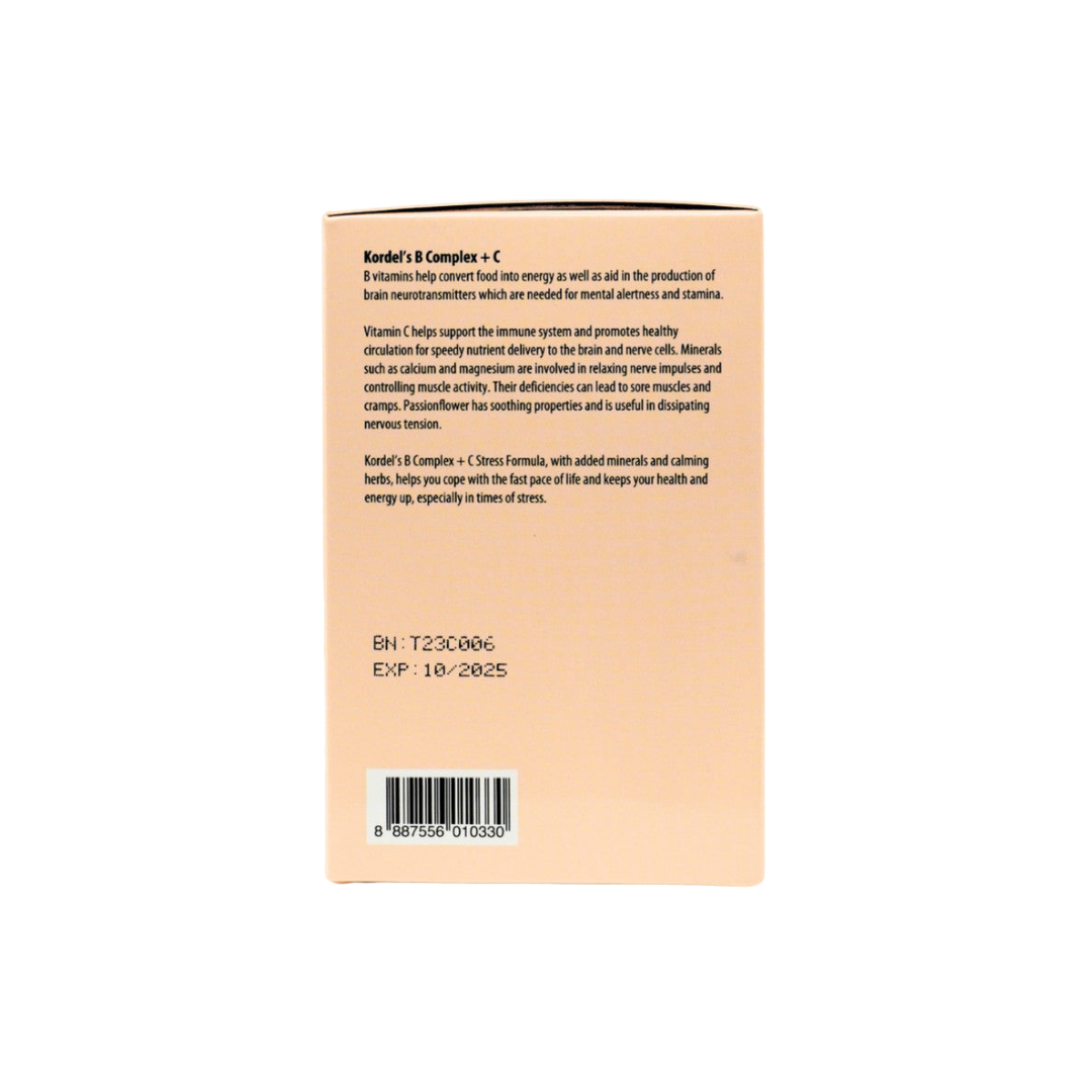 Kordel’s B Complex + C Stress Formula, with added minerals and calming herbs, helps you cope with the fast pace of life and keeps your health and energy up, especially in times of stress.
