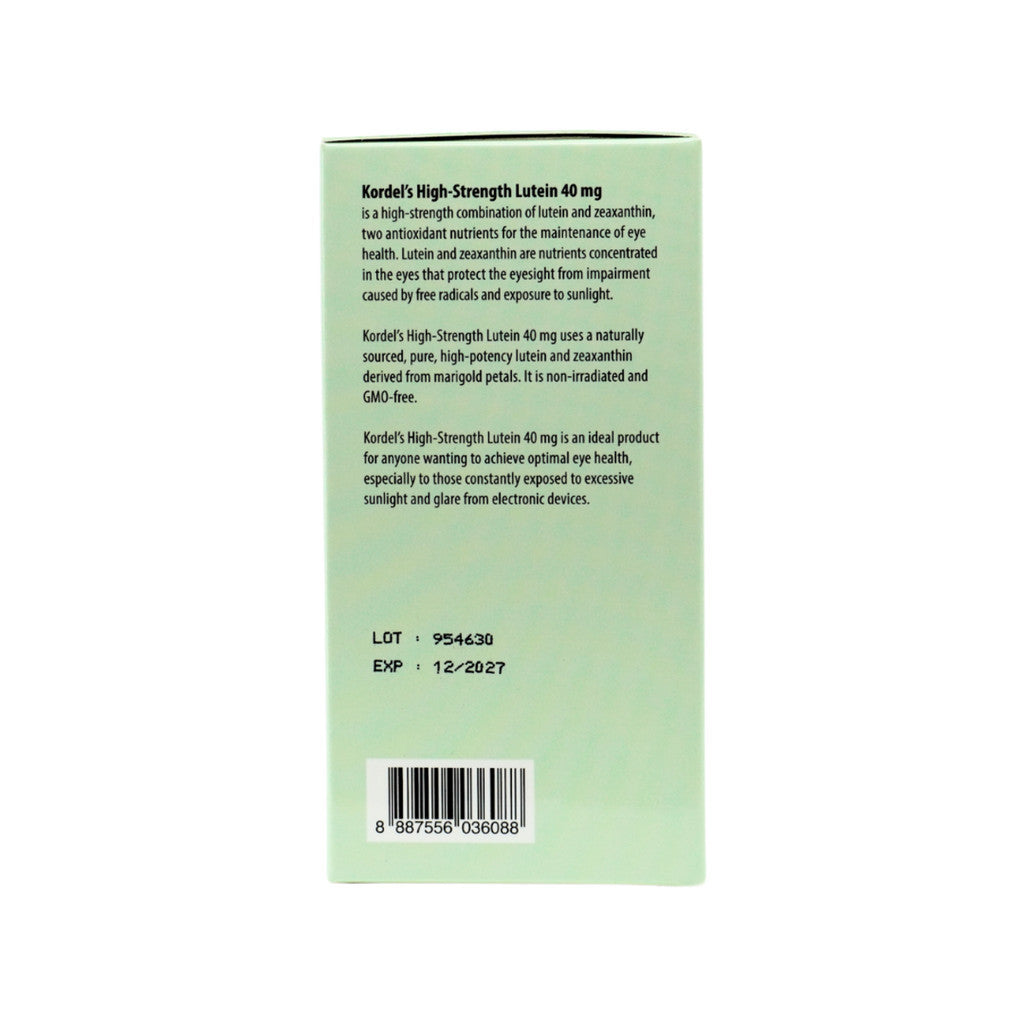 Kordel’s High-Strength Lutein 40 mg is a high-strength combination of lutein and zeaxanthin, two antioxidant nutrients for the maintenance of eye health. Lutein and zeaxanthin are nutrients concentrated in the eyes that protect the eyesight from impairment caused by free radicals and exposure to sunlight.