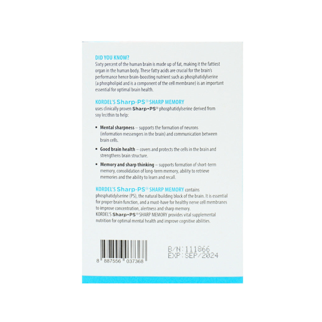 SHARP.PS SHARP MEMORY contains phosphatidylserine (PS), the natural building block of the brain. It is essential for proper brain function, a must-have for healthy nerve cell membranes, leading to improve concentration, alertness and sharp memory. KORDEL’S Sharp•PS SHARP MEMORY provides the needful supplemental nutrition for optimal mental health and improve cognitive abilities.