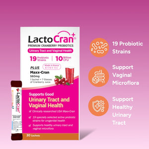 Relieve pesky urinary tract infection (UTI) with LactoCran+ Premium Cranberry Probiotics 30’s! LactoCran + probiotics work in a synergistic triple effect combining USA CranMax with specially selected 19 active probiotics, 10 Billion CFU and prebiotics to block the pathogenic effects of many UTI causing bacteria.