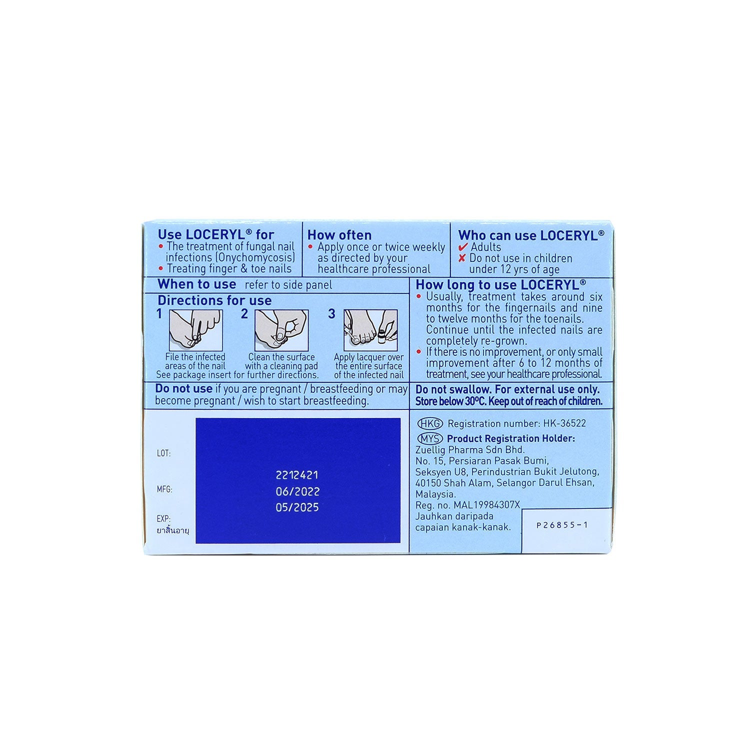 Apply this medicine exactly as directed by your doctor/pharmacist or according to the instructions on the label. Do not apply more or less than instructed. Direction of use: 1. Wash and dry the affected area thoroughly. 2. Before the first application, file down the affected areas of the nail (including the nail surfaces) using the nail file provided. 3. Clean the nail surface with a cleaning pad provided after filing. Repeat steps 2 and 3 for each affected nail. 4. Dip one of the reusable applicators provided into the bottle of medicated nail lacquer. Do not wipe off the lacquer on the edge of the bottleneck before it is applied. 5. Apply the nail lacquer evenly onto the entire surface of the infected nail and allow it to dry for about 3-5 minutes. Repeat steps 4 and 5 for each affected nail. Cosmetic nail lacquers may be applied at least 10 minutes after applying Amorolfine nail lacquer. 6. After use, clean the reusable applicator thoroughly with the same cleaning pad used for nail cleaning. Avoid touching newly treated nails with the used cleaning pad. 7. Tightly close the nail lacquer bottle. Dispose the used cleaning pads carefully. 8. Before subsequent application, carefully remove any remaining Amorolfine nail lacquer or cosmetic nail lacquer (if any). File down the affected nails again as necessary and clean the nail surfaces thoroughly before application. 9. Do not use the nail files for infected nails on healthy nails to prevent the spread of the infection. Avoid contact with your eyes, ears, nostrils, or mouth. If this medicine gets into these areas, rinse immediately with water. Alert your doctor if you start to have any problems with your eyes. Apply Amorolfine at regular intervals. Do not skip any doses. You must complete the entire course of this medicine. If you don't, the infection will not be properly controlled.