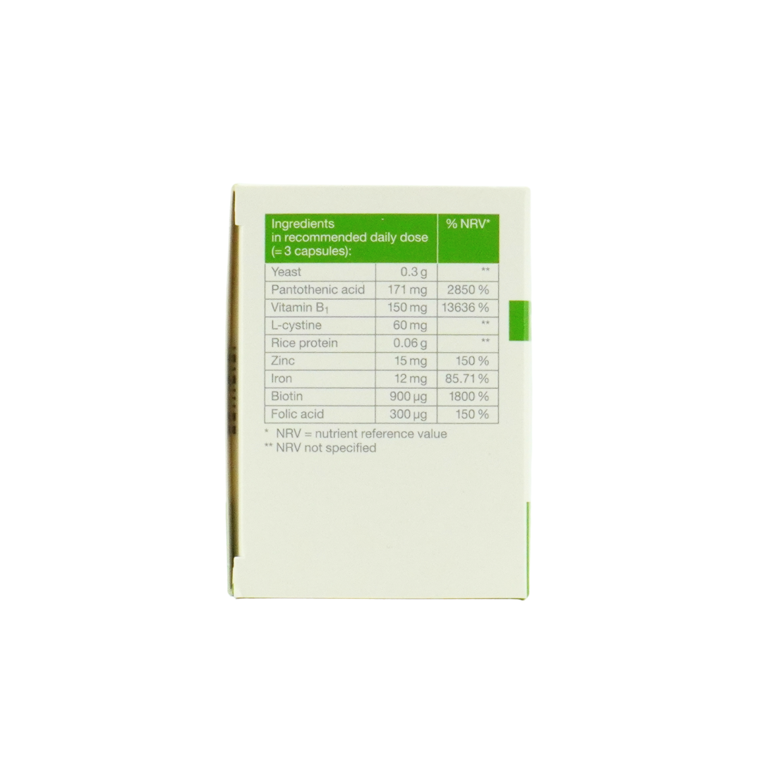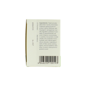 Yeast powder (Saccharomyces cerevisiae); Capsule casing (hydroxypropyl methylcellulose; gelling agent: carrageenan; acidity regulator: potassium acetate); D pantothenate calcium; thiamin mononitrate; L-cystine; rice protein; zinc sulphate monohydrate; iron(II) citrate; anti-caking agent: silicon dioxide, magnesium salts of fatty acids; bulking agent: microcrystalline cellulose; D-biotin; pteroymono glutamic acid.