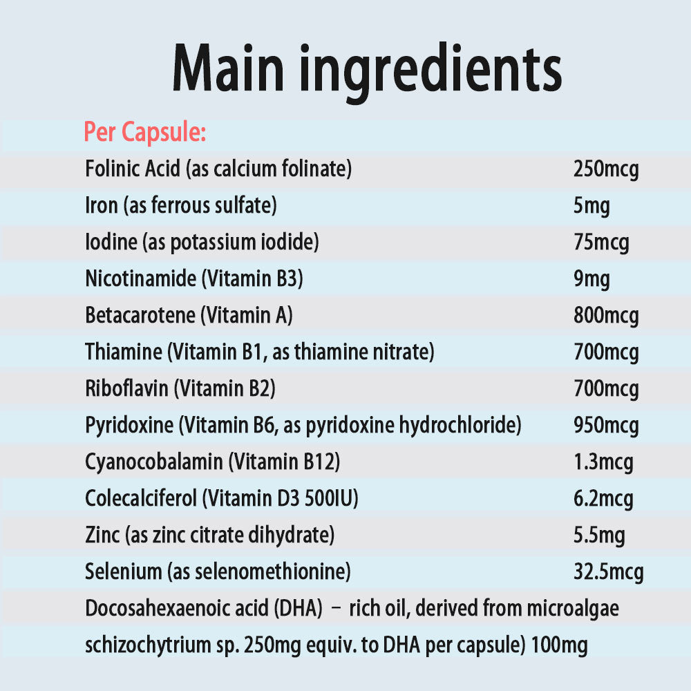 - Docosahexaenoic acid (DHA) – rich oil, derived from microalgae schizochytrium sp. 250mg equiv. to DHA per capsule) 100mg