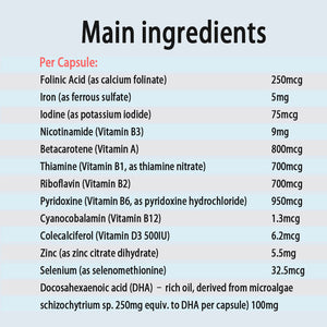 Contains soy products. Always read the label and follow the directions for use. Do not use if seal is broken or missing. Vitamins and minerals can only be of assistance if dietary intake is inadequate. Advise your doctor of any medicine you take during pregnancy, particularly in your first trimester. If you are concerned about the health of yourself or your baby, talk to your health practitioner. This product contains selenium which is toxic in high doses. A daily dose of 150 micrograms for adults of selenium from dietary supplements should not be exceeded.