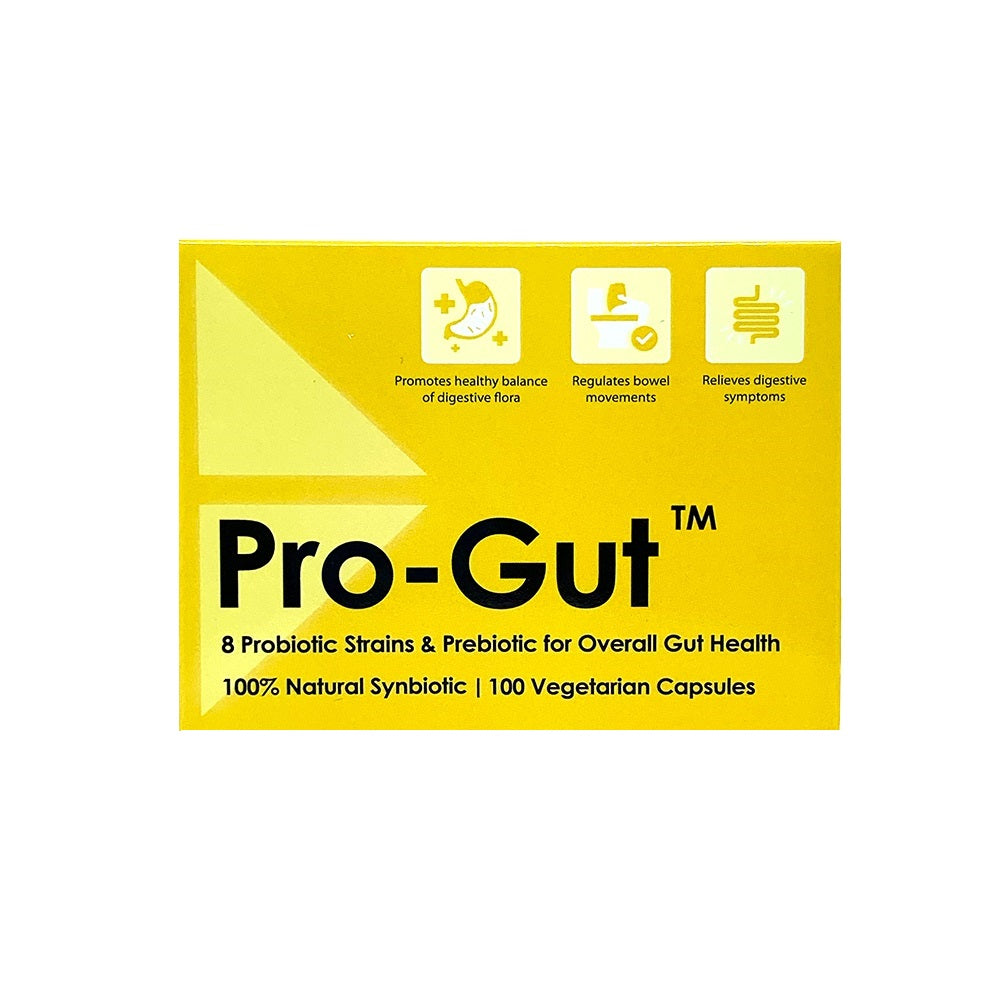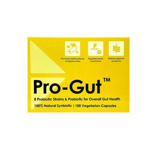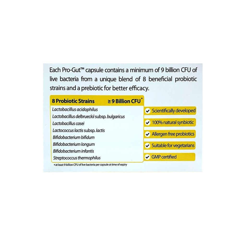 Each Pro-Gut capsule contains a minimum of 9 billion live bacteria from a unique blend of 8 different probiotic strains that are characteristic of a healthy normal human gut microflora, and include strains of Lactobacillus, Bifidobacterium and Streptococcus. To ensure the survival of these bacteria during the journey through the stomach, Pro-Gut is micro-encapsulated. In addition, the prebiotic inulin is included to stimulate the growth of friendly and healthy intestinal bacteria which supports good colon health.