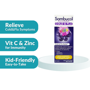 Children love the taste of Sambucol Black Elderberry Cold & Flu Relief Kids Liquid! This powerful medicine is packed with black elderberry, elderflower, honey, zinc and vitamin C that relieves children of cold and flu symptoms. This oral liquid contains black elderberries as its main antioxidant ingredient that gives it an overall berry flavour!