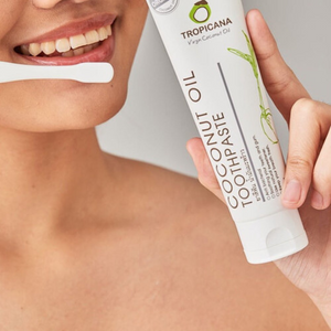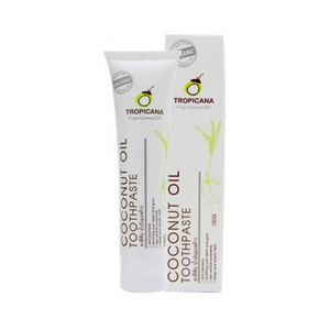 Tropicana Coconut Oil Toothpaste combines the natural benefits of coconut oil with tea tree oil, clove oil, aloe vera extract, and guava leaf extract. This gentle, chemical-free toothpaste helps reduce plaque, strengthen gums, and freshen breath while soothing sensitive teeth and supporting overall oral health. Safe for daily use, it keeps your smile naturally clean, healthy, and refreshed.