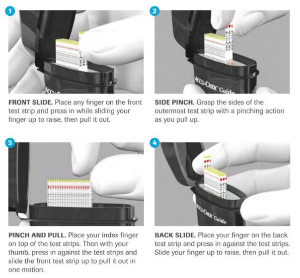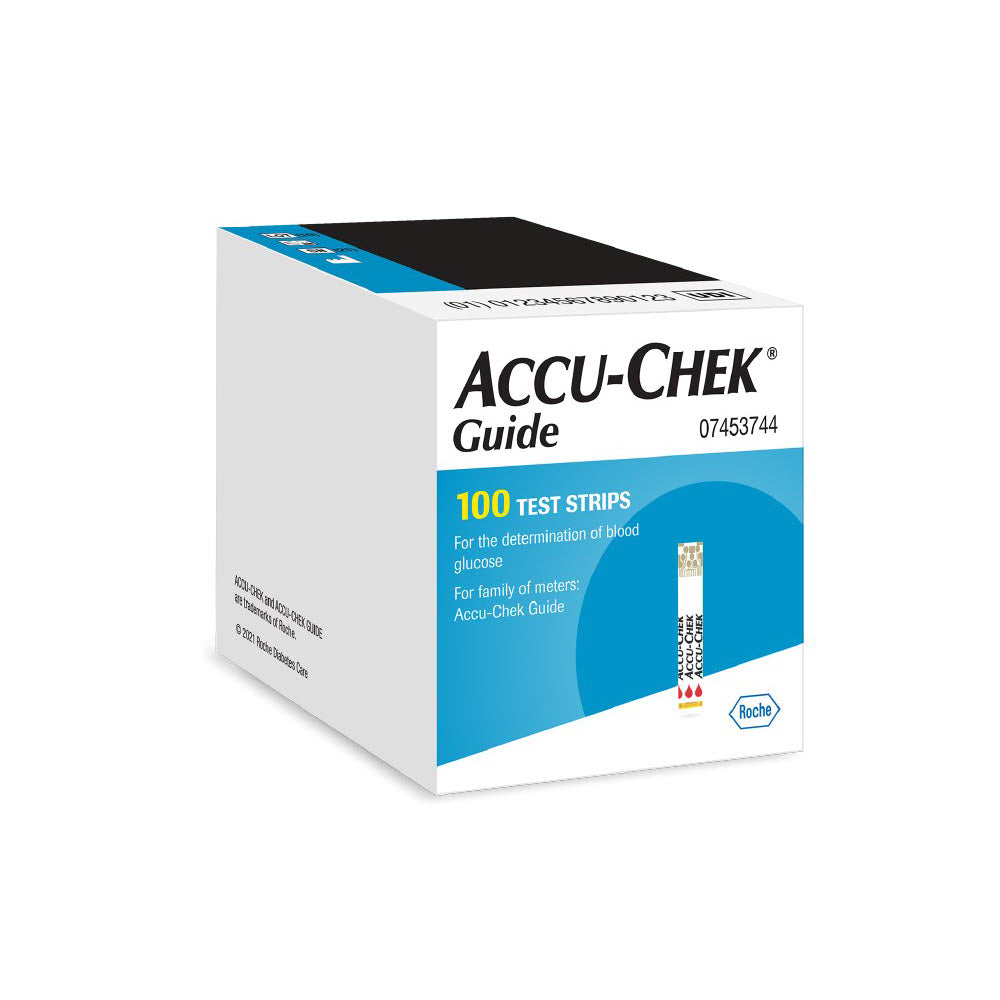 包含 2x 50 个 Accu-Chek Guide 试纸瓶,配有防溢试纸瓶和宽试纸剂量区域,可轻松涂抹血样。