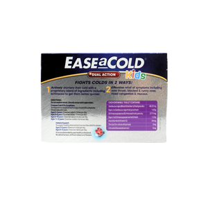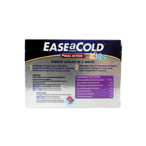 Ease a Cold Kids 感冒和流感咀嚼片适用于2岁以上的儿童。Ease a Cold Kids 感冒和流感咀嚼片不仅有助于缓解症状,入口即化的美味浆果味更令人回味无穷!