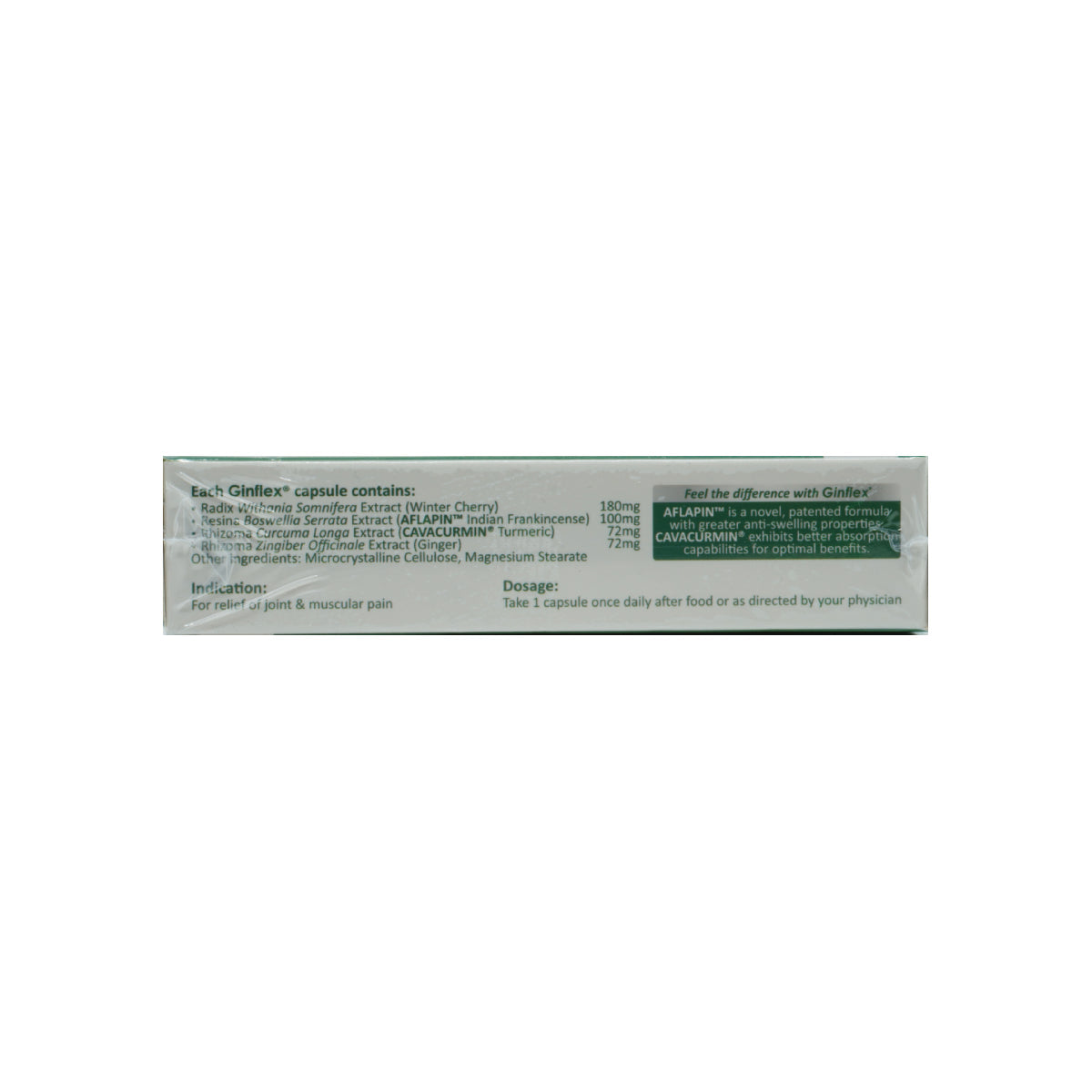Ginflex 是一款天然无药物配方,可缓解关节和肌肉疼痛。Ginflex 胶囊含有四种活性成分,包括阿夫拉平、生姜、姜黄和冬樱桃,可减轻疼痛和肿胀。