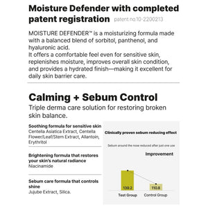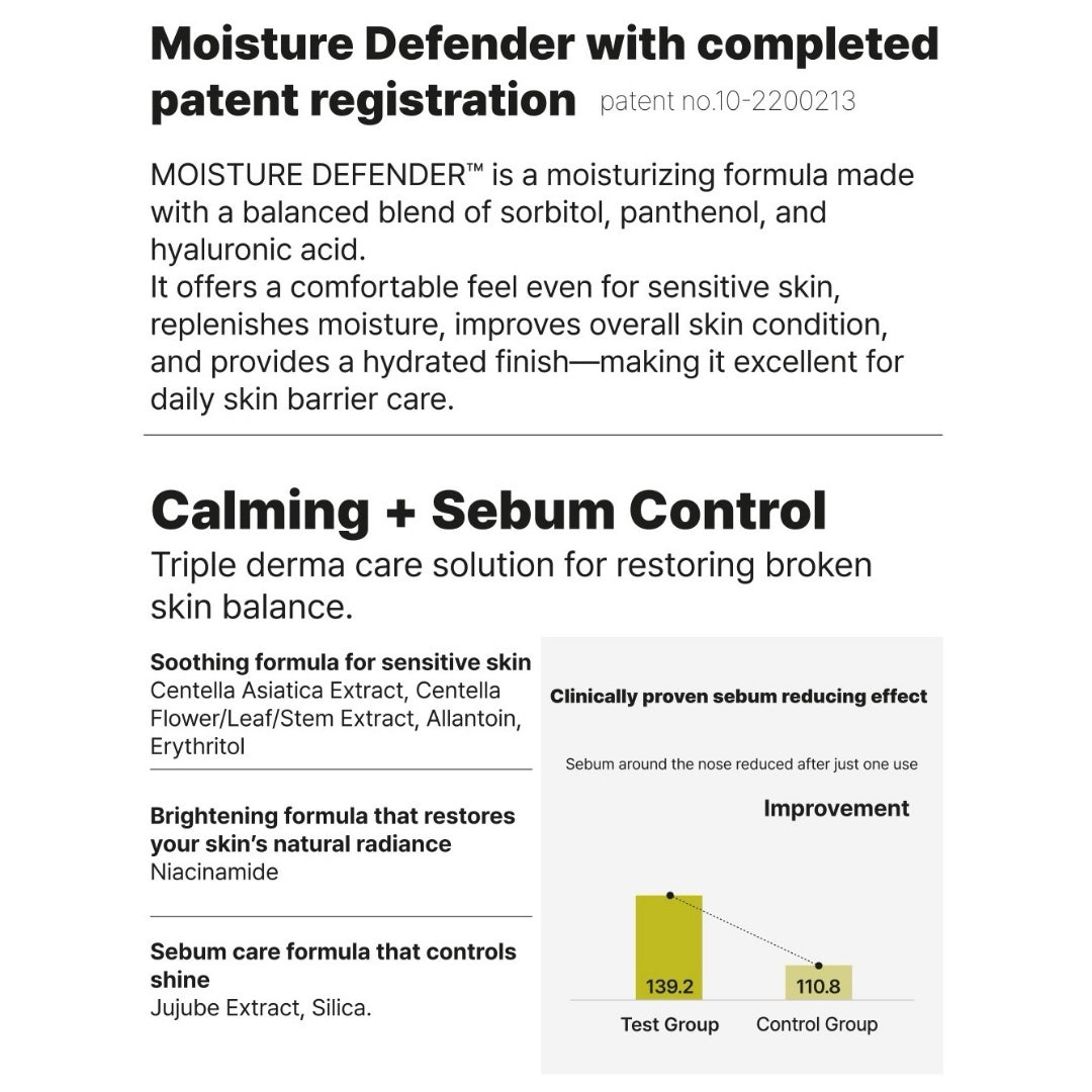 A next-generation sun serum with SPF 50+ PA++++ that protects against UVA, UVB, and infrared rays. Powered by patented MOISTURE DEFENDER™, Centella Asiatica, and Jujube Extract, it cools, hydrates, and soothes the skin while balancing sebum for a fresh, radiant finish. Lightweight and non-greasy, it delivers all-day comfort even under the sun.