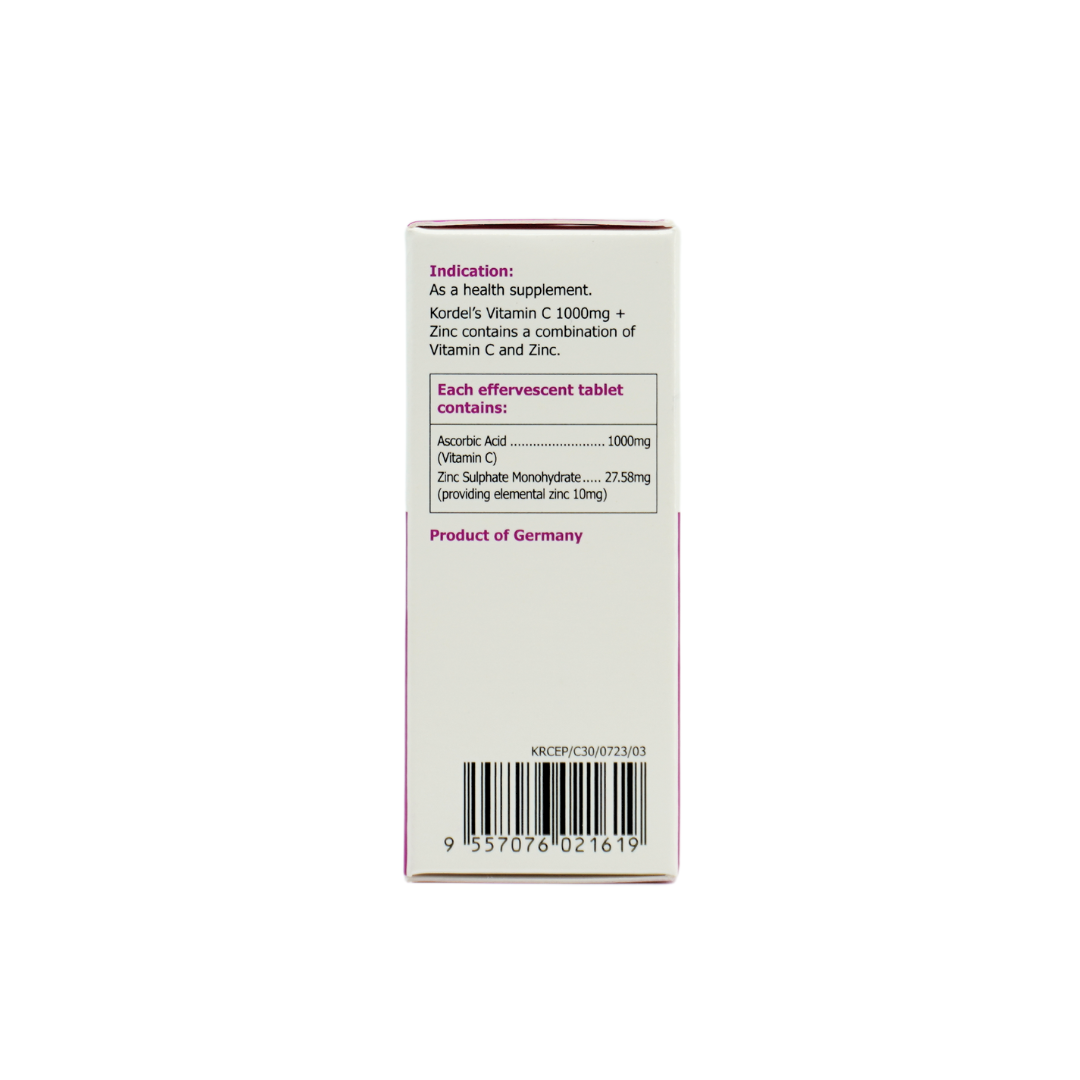 Kordel's 泡腾片维生素C添加了锌,与维生素C协同作用。锌是一种具有抗氧化和抗炎特性的矿物质。维生素C是一种强大的抗氧化剂,有助于增强免疫系统。它对促进生长发育至关重要,还能提高人体组织(例如皮肤和血管)的再生能力。维生素C还有助于防止自由基对身体的损伤,并维持免疫系统的正常功能。本产品含有两种有助于增强免疫系统的重要营养素。研究表明,这种组合可以减轻流感和感冒的严重程度,并缩短其他呼吸道感染的持续时间。