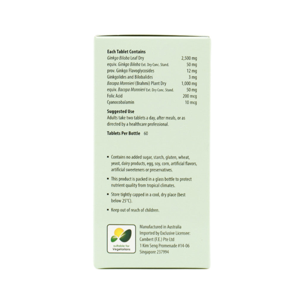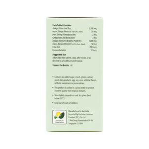 银杏(银杏)和假马齿苋(婆罗米)分别促进心脏的血液循环和大脑的认知功能。这些作用对保持精神警觉、记忆力和血管健康至关重要。
