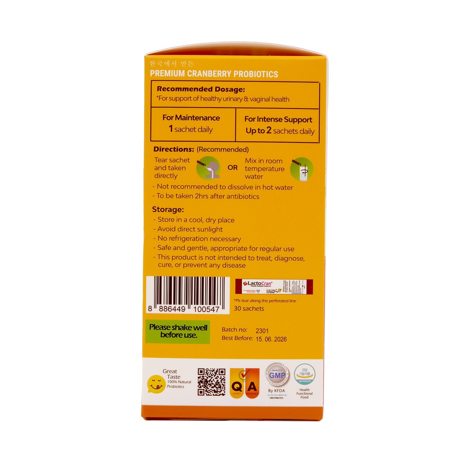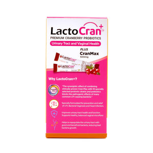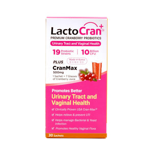 使用 LactoCran+ 优质蔓越莓益生菌 30 粒,缓解恼人的尿路感染 (UTI)!LactoCran + 益生菌三重协同效应,将美国 CranMax 与特选的19 种活性益生菌、100 亿菌落形成单位 (CFU)和益生元相结合,阻断多种导致尿路感染的细菌的致病作用。