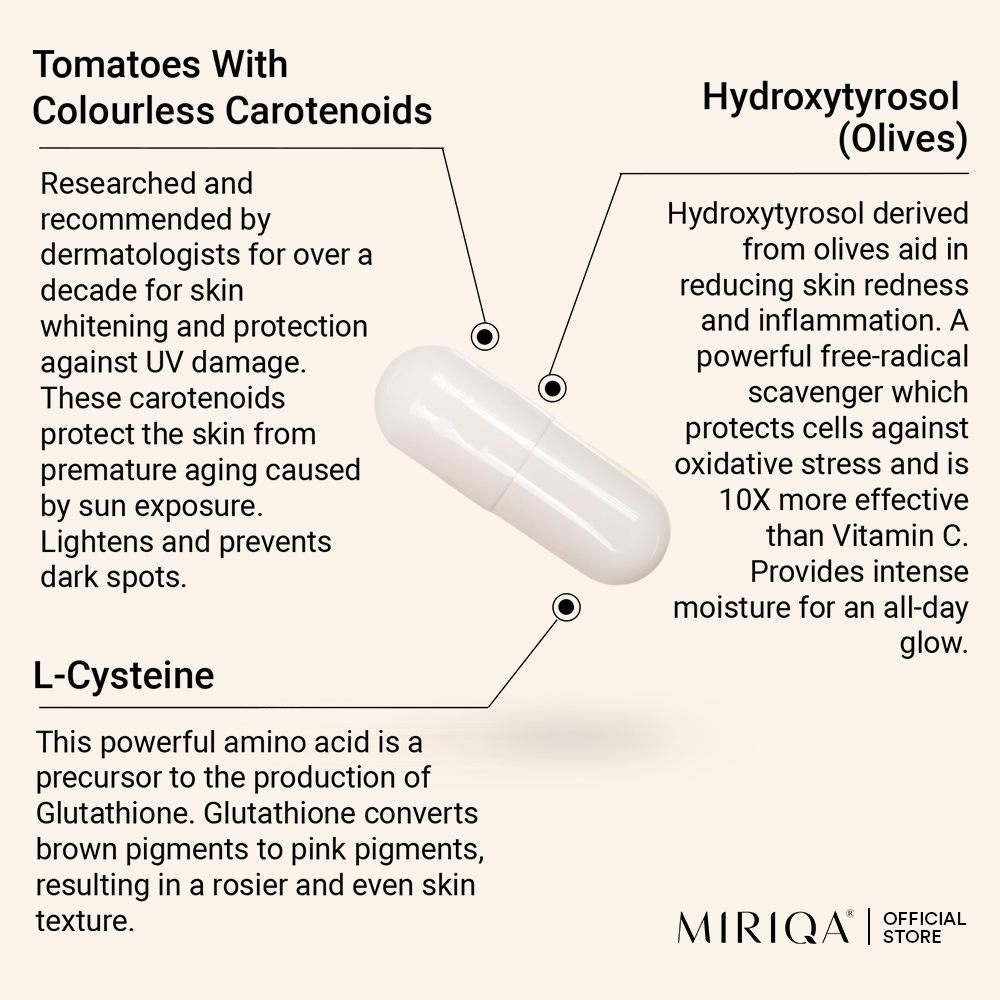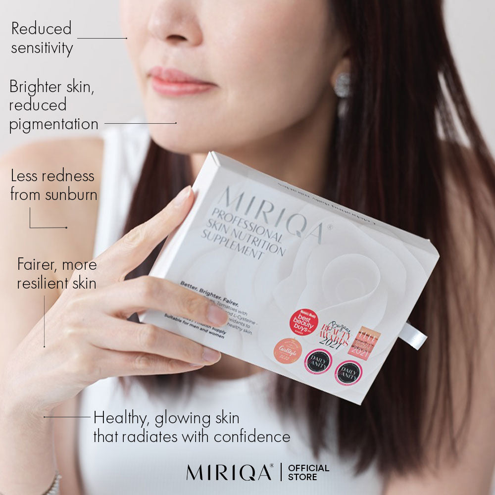 MIRIQA® 专业护肤营养补充剂。为了更佳、更亮丽、更白皙的肌肤。自然改善肌肤健康。100% 不含药物成分,采用全天然成分,经临床验证,可提亮肤色,减少痘痘爆发,促进肌肤健康。蕴含橄榄、番茄、无色类胡萝卜素和 L-半胱氨酸等多种超级抗氧化剂,打造强韧、美丽、健康的肌肤。