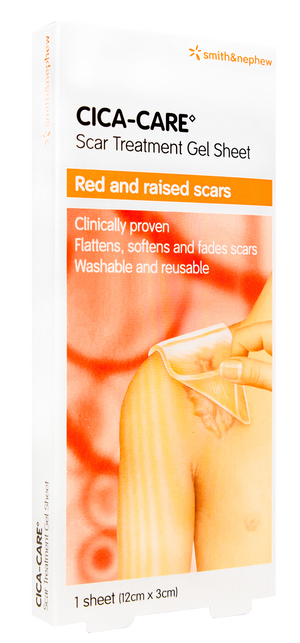 scars. In patient trials, up to 90% of scars improved in appearance by softening, flattening, and fading. CICA-CARE can also be used as soon as a wound has healed to help prevent a red or raised scar from forming. The CICA-CARE adhesive gel sheet is soft, comfortable, and simple to apply. It can be cut to size to fit most scars. Durable, reusable, and flexible, it is ideal for either day or night use. Best results are seen after 2 to 4 months of treatment time. The gel sheet must be cleaned twice daily with mild soap. Once treatment is complete, continued use of CICA-CARE is not required to maintain the reduced appearance of the scar.