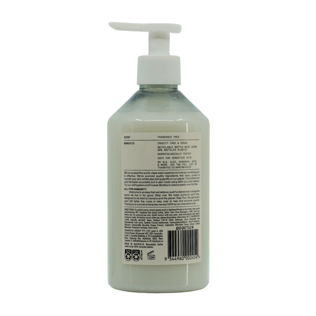 Thankyou 无香型洗手液,滋养功效兼具。它蕴含优质成分,清洁、保护和滋养肌肤,同时温和呵护地球。这款洗手液瓶身不仅可路边回收,而且采用 98% 的再生材料制成。