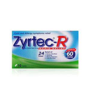 Zyrtec-R 可在 24 小时内快速缓解感冒和过敏症状,如流鼻涕、鼻子发痒、打喷嚏、流泪和眼睛发痒以及皮疹发痒。
